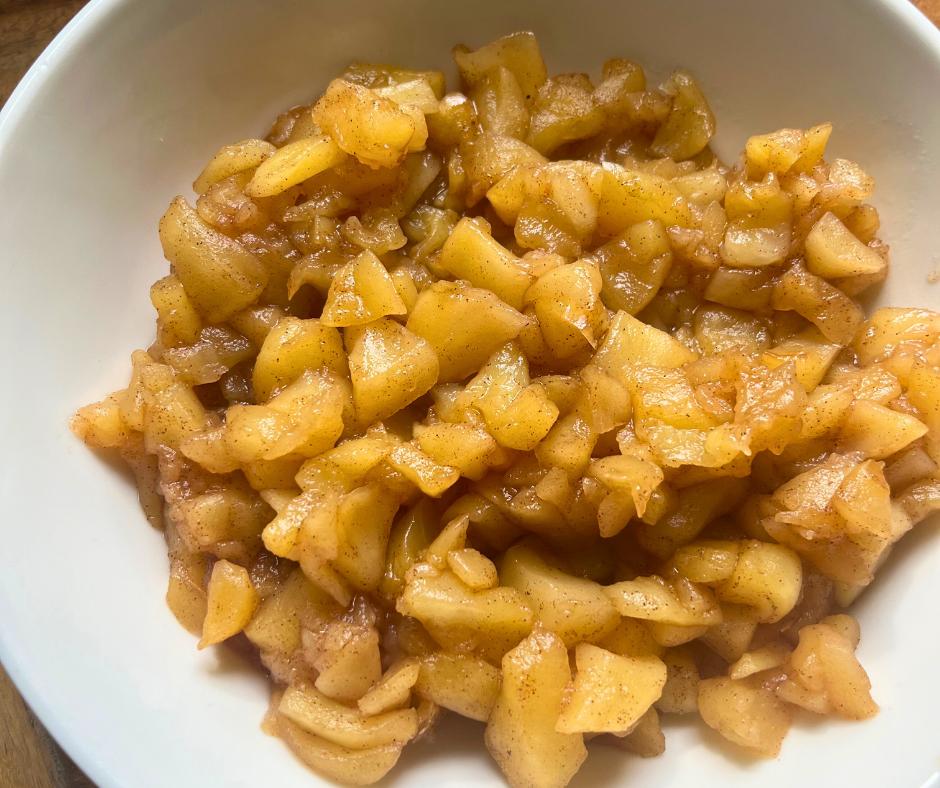 Während der Cheesecake im Ofen ist, bereiten wir die Äpfel für das Topping vor. Hierfür machen wir quasi einen Apfelkompett, wofür wir die geschälten und klein geschnittenen Äpfel in einem Kochtopf mit 3 EL Zucker, 3 EL Wasser und 1 EL Zimt aufkochen und köcheln lassen, bis das Wasser was komplett verkocht ist und das Apfelkompott schön „matschig“ ist.