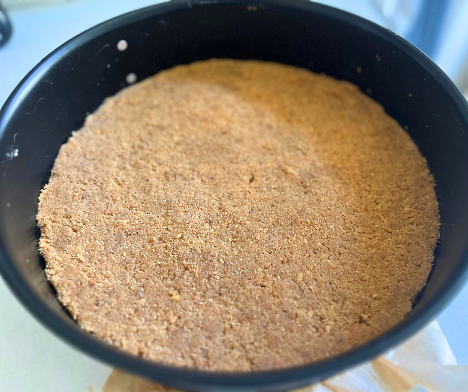 - Backofen auf 180 Grad Umluft vorheizen. Walnüsse kurz anrösten (entweder in der Pfanne oder in der Heißluftfritteuse) und anschließend klein hacken oder mit dem Mixer zerkleinern. Kekse zerbröseln. Butter zerlassen. Alles miteinander vermengen. Eine Springform (26 cm) mit Backpapier auslegen und die Masse auf dem Boden verteilen und festdrücken. Für 10 min. auf dem Rost backen und auskühlen lassen.