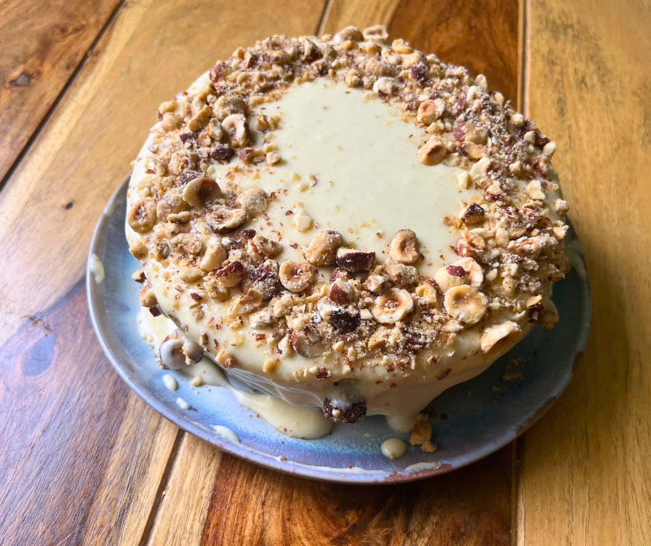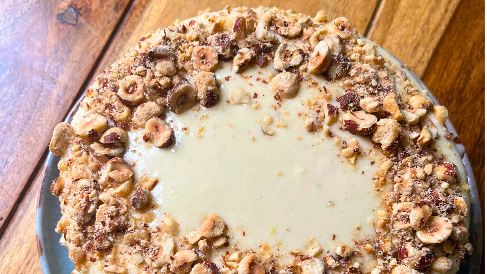 • Um den Kuchen anzurichten, wird er der Länge nach durchgeteilt. Die untere Hälfte etwas mit der Chai-Milch beträufeln. Danach die eine Hälfte des Frostings auf die untere Hälfte des Kuchens geben. Dann die zweit Hälfte des Kuchens draufgeben und festdrücken. Die zweite Hälfte des Frostig oben auf den Kuchen geben. Die Haselnüsse rösten und in kleine Stücke hacken und den Kuchen damit dekorieren.