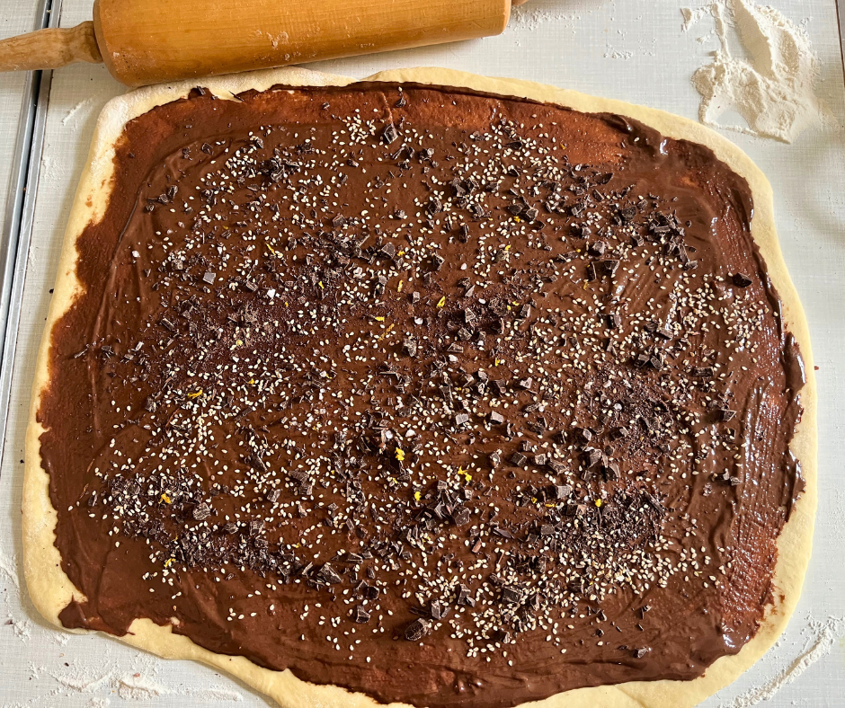 Nach der Gehzeit wird der Teig auf einer bemehlten Arbeitsfläche zu einem großen Rechteck ausgerollt. Für die Füllung die Schokolade klein hacken und die Hälfte davon in der Mikrowelle oder im Wasserbad schmelzen. Die übrige Schokolade beiseite stellen. Zu der geschmolzenen Schokolade nun Tahini und Nuss-Nougat-Creme hinzufügen und kurz weiterschmelzen lassen, bis eine geschmeidige Masse entsteht.