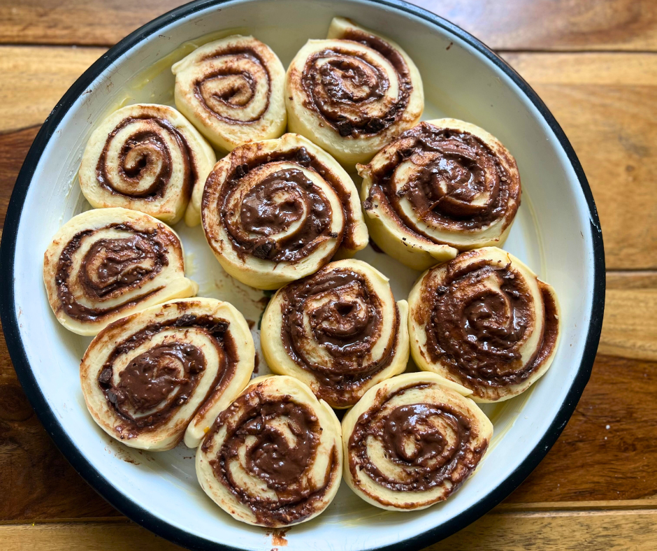 - Den Teig von der langen Seite aus aufrollen und hiervon gleichmäßig mit dem Messer die Schnecken abschneiden. Die Schnecken mit etwas Abstand zueinander in eine gefettete Form geben. Diese nochmal abgedeckt für ca. 30 Minuten gehen lassen und währenddessen den Backofen auf 180 Grad Ober- Unterhitze für 20-25 Minuten backen lassen.